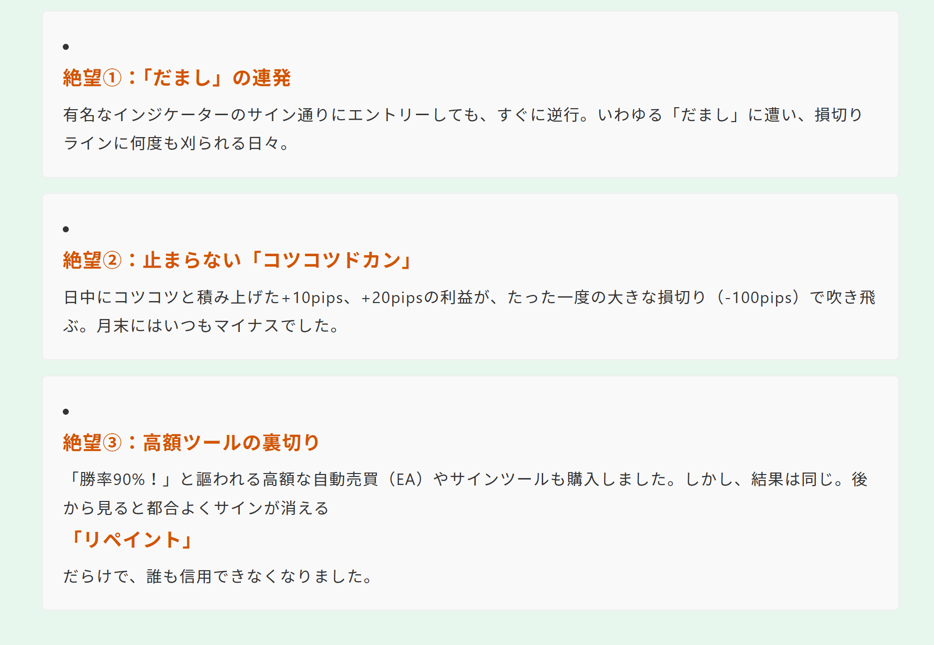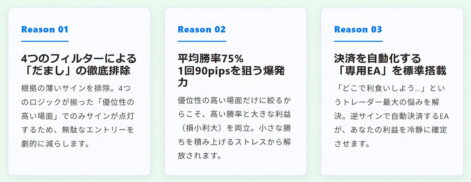 FX歴3年ですが、サインが出ても逆行する「だまし」に悩まされ、コツコツドカンを繰り返していました。これは4つのフィルターが揃わないとサインが出ないので、本当に優位性の高い場面だけを待てるようになり、無駄なエントリーが激減。初めて月次で安定してプラスになりました。