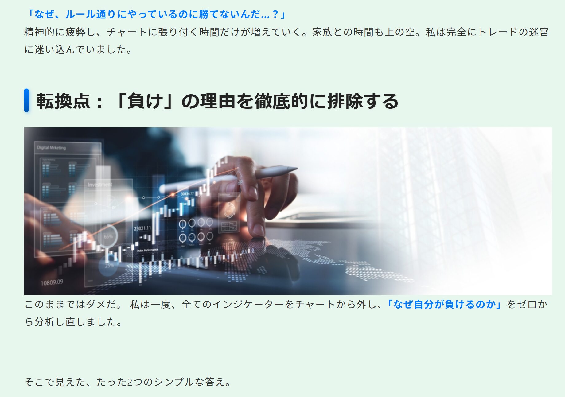 負けが込んでいた頃はチャートを見るのが苦痛でしたが、今は「4つのサインが揃うかな」と探すのが楽しみになりました。精神的に安定したのが一番の収穫です。優位性のあるポイントを待つ、という本質的なトレードが身につきました。