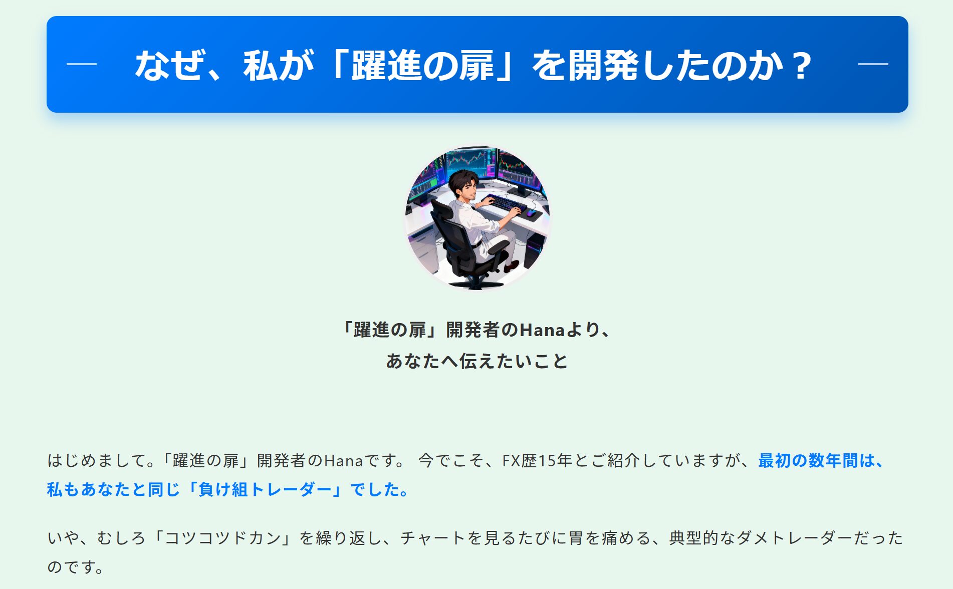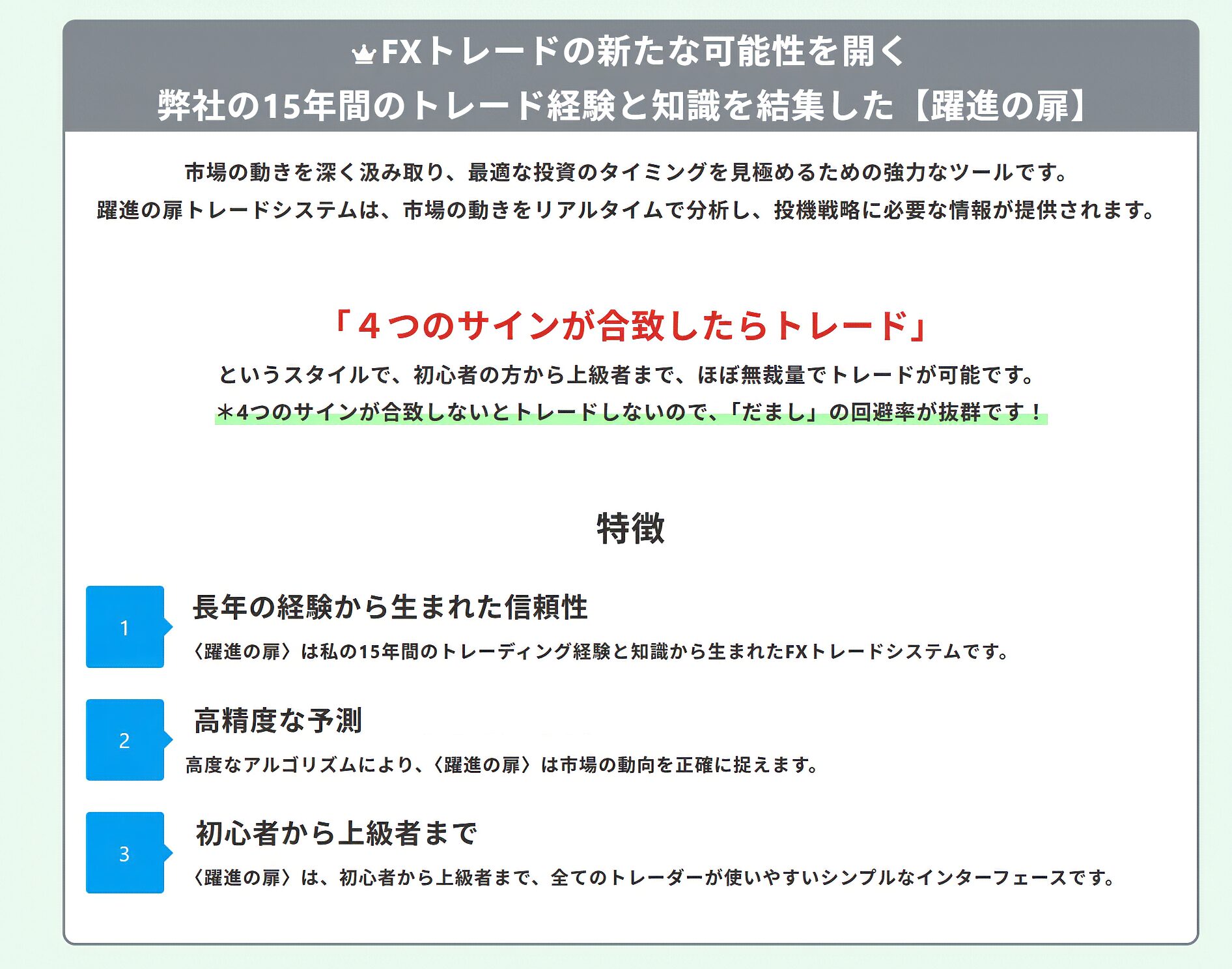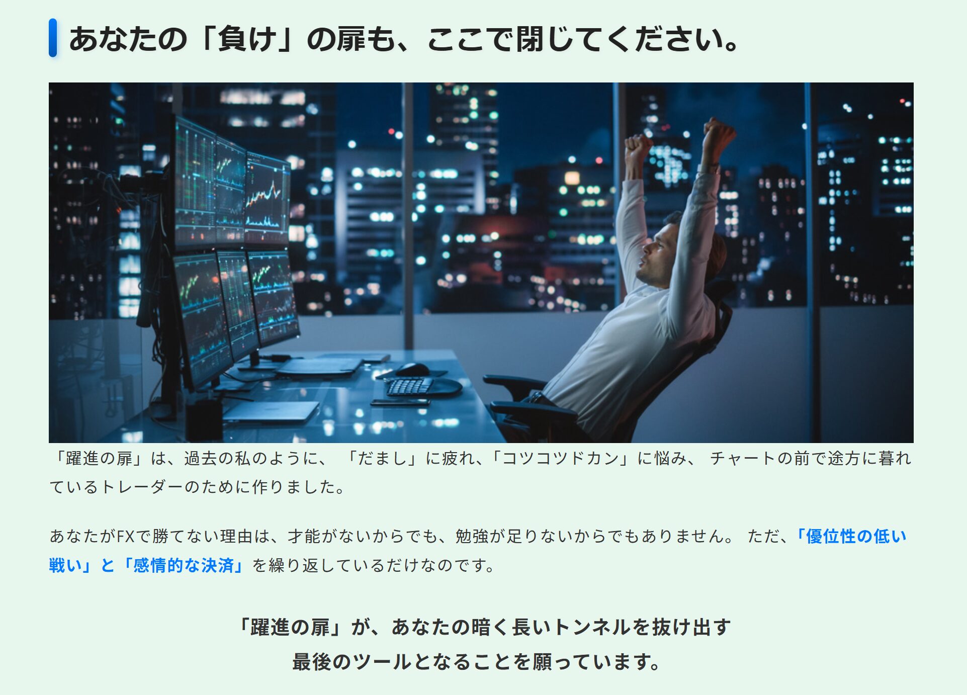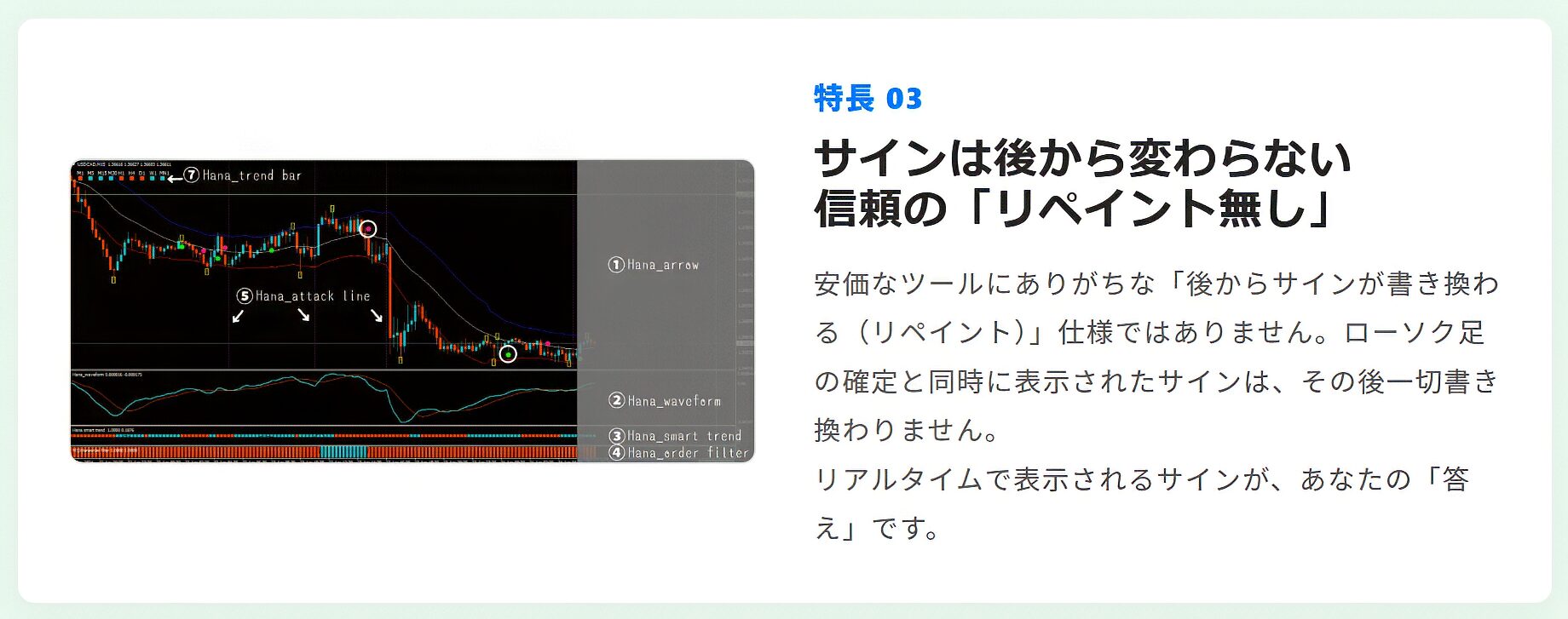 過去に買ったツールはリペイントがひどく、後から見たら「勝ってる」ように見える詐欺のようなものでした。「躍進の扉」はサインが確定したら二度と変わらない。リアルタイムのサインを信じてトレードできる安心感が素晴らしいです。