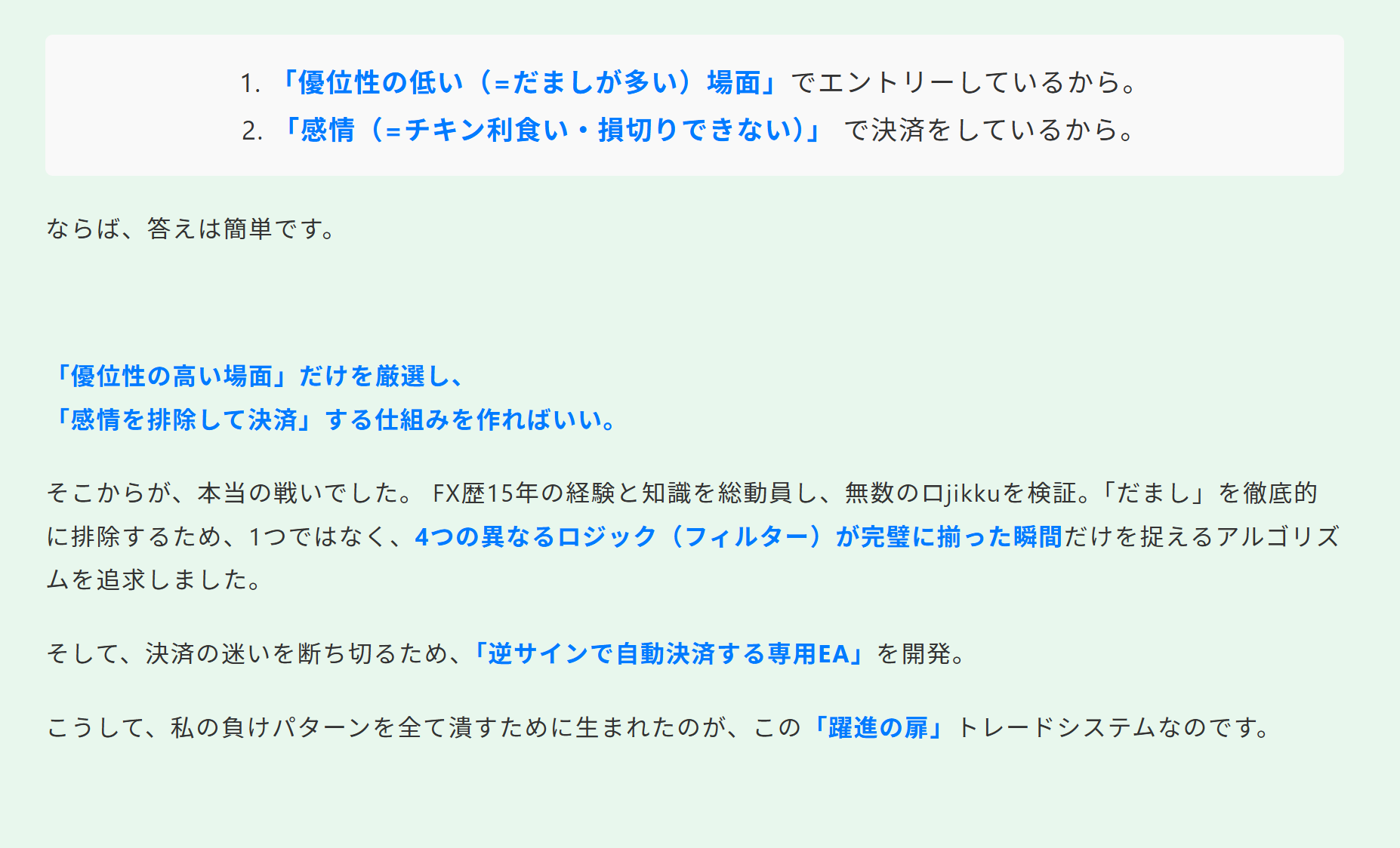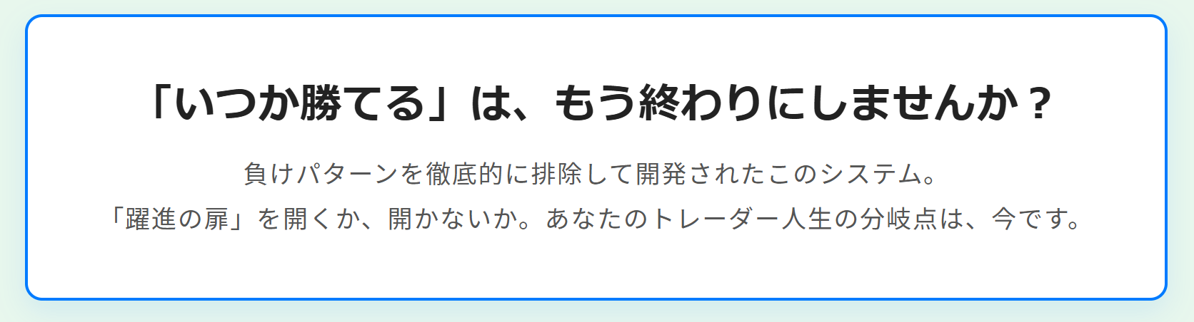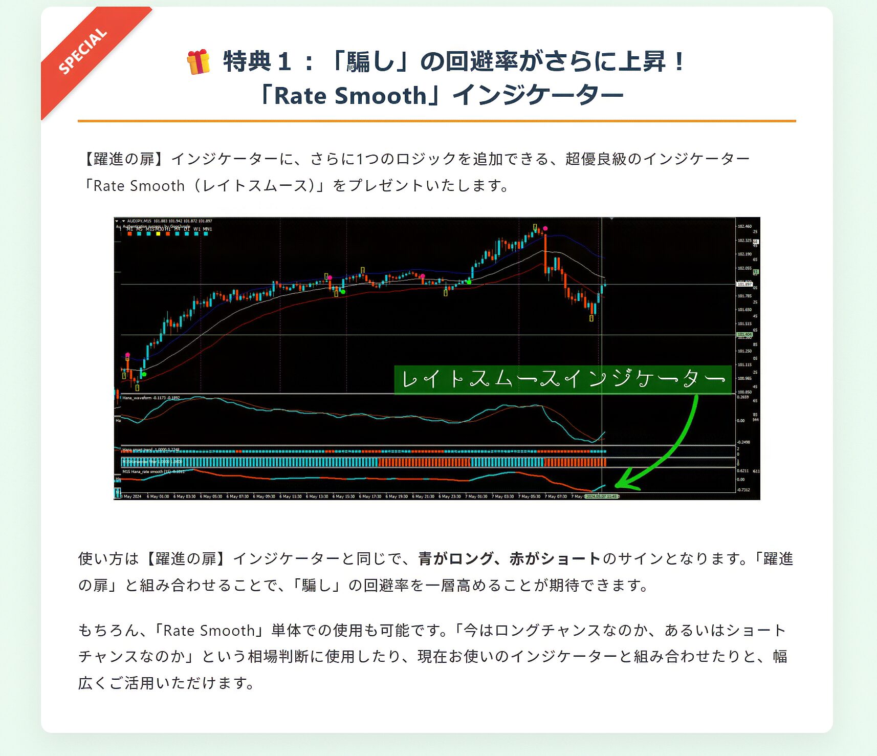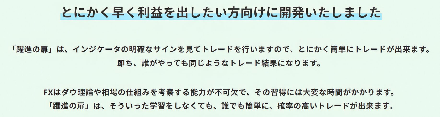 過去に買ったツールはリペイントがひどく、後から見たら「勝ってる」ように見える詐欺のようなものでした。「躍進の扉」はサインが確定したら二度と変わらない。リアルタイムのサインを信じてトレードできる安心感が素晴らしいです。