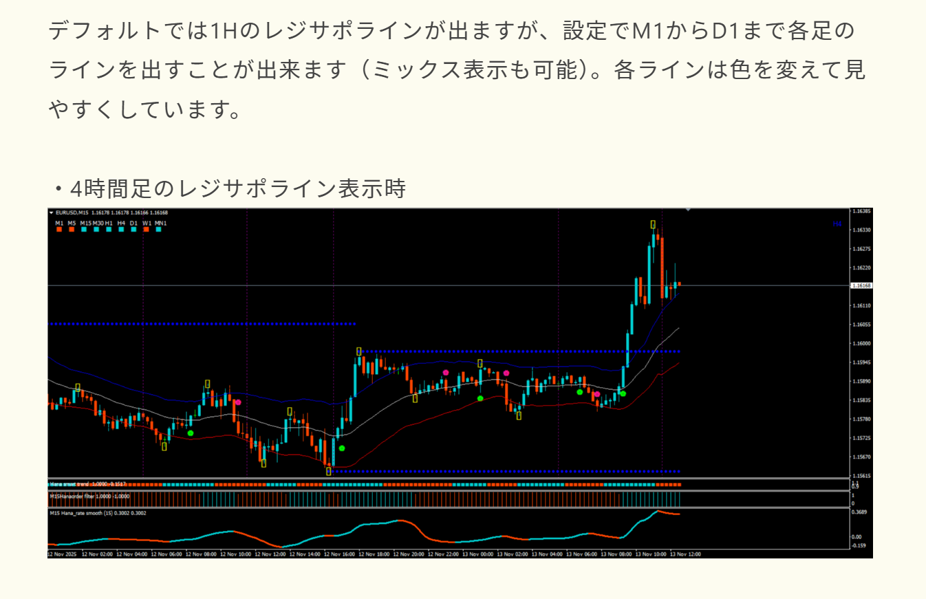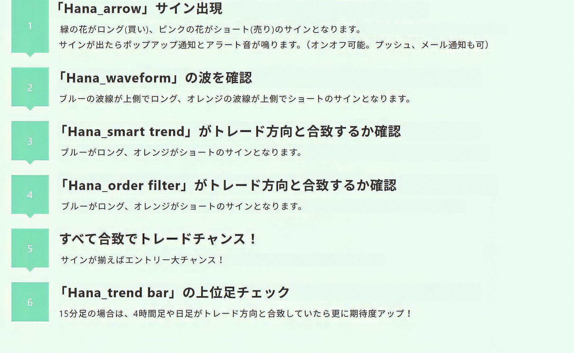 裁量判断に自信が持てませんでしたが、これは「4つ揃ったらエントリー」というルールが明確なので、初心者でも迷いません。特にHana_waveformが今のトレンド方向を示してくれるので、大きな流れに逆らわなくなりました。