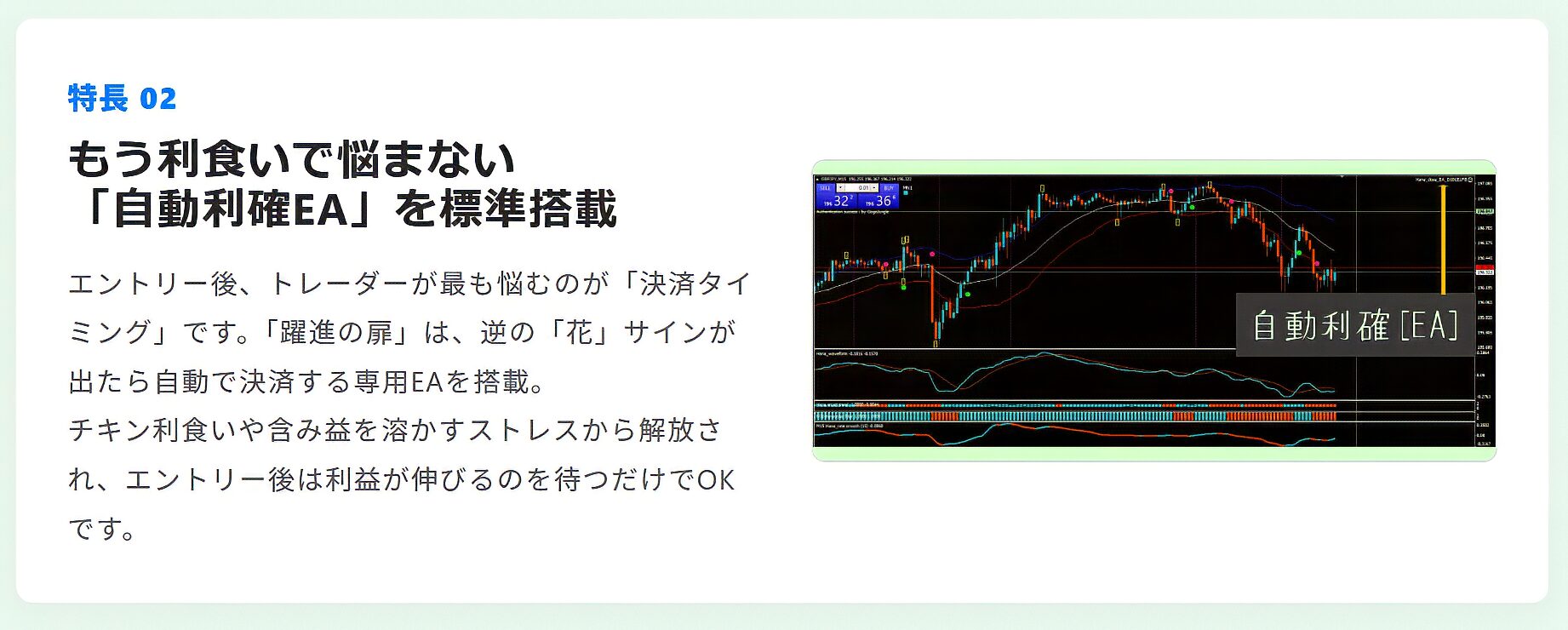 エントリー後のチキン利食いが悩みでした。「躍進の扉」は、逆サインで自動決済してくれるEAが本当に優秀です。仕事中や家事の途中でも、利益を伸ばすべきところでしっかり伸ばし、冷静に決済してくれる。もうチャートに張り付かなくてよくなりました。